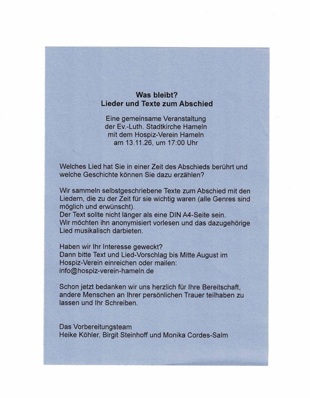 Wir sammeln selbstgeschriebene Texte zum Abschied mit den Liedern ...